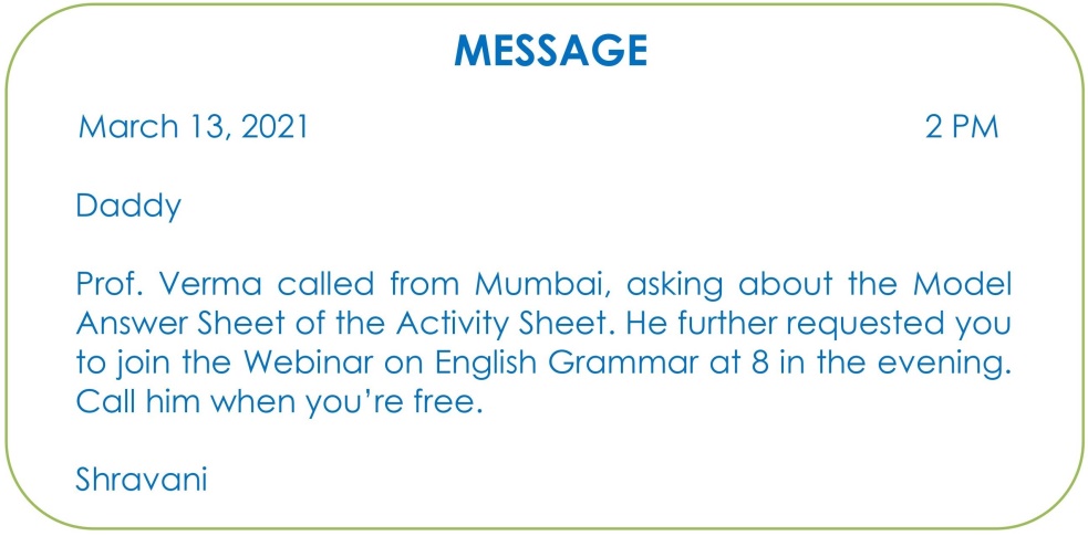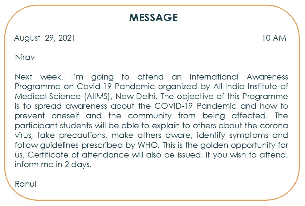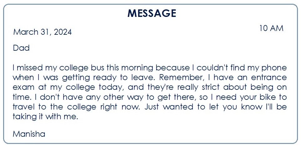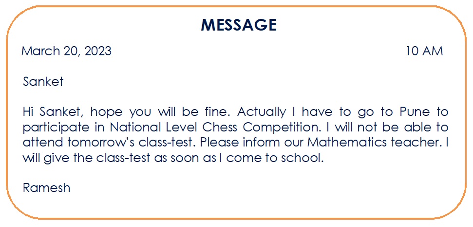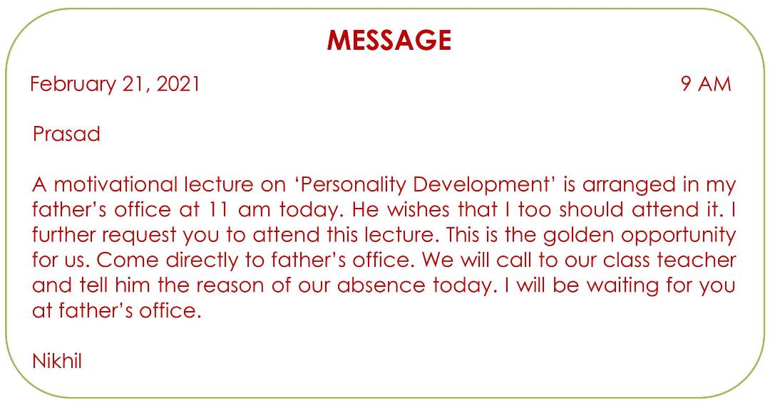 Drafting a Virtual Message is a key writing skill that involves creating a short, clear, and formal note for someone when you cannot speak to them directly. It typically involves converting a phone conversation or a specific situation into a brief written message. It effectively bridges the gap between oral communication and written records, ensuring that important information is not lost or misinterpreted. By focusing on brevity and accuracy, this skill prepares students for real-world professional environments where clear, concise messaging is essential.